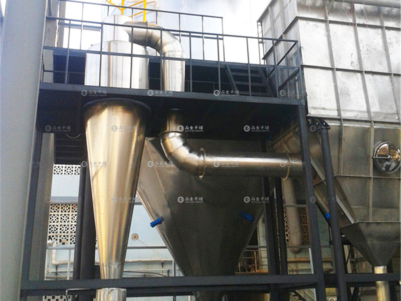 空氣經(jīng)過濾和加熱,進(jìn)入干燥器頂部空氣分配器,熱空氣呈螺旋狀均勻地進(jìn)入干燥室。料液經(jīng)塔體頂部的高速離心霧化器,(旋轉(zhuǎn))噴霧成極細(xì)微的霧狀液珠,與熱空氣并流接觸在極短的時(shí)間內(nèi)可干燥為成品。成品連續(xù)地由干燥塔底部和旋風(fēng)分離器中輸出,廢氣由風(fēng)機(jī)排空。