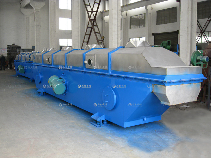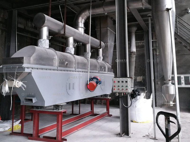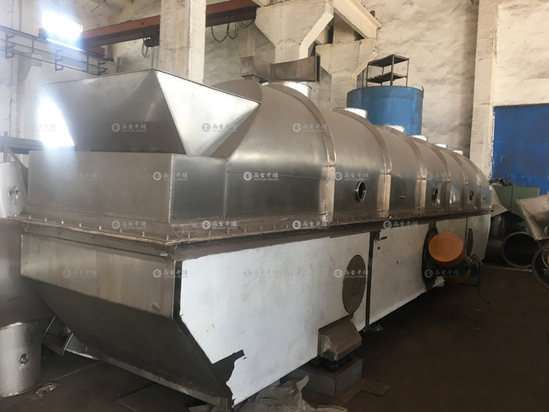 物料自進(jìn)料進(jìn)口進(jìn)入機(jī)內(nèi),在振動(dòng)力作用下,物料沿水平面流化床拋擲,向前連續(xù)運(yùn)動(dòng),熱風(fēng)向上穿過流化床同濕物料換熱后,濕空氣經(jīng)旋風(fēng)分離器除塵后由排風(fēng)1:3排出,干燥物料由排料進(jìn)口排出。