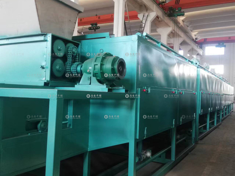 物料由加料器均勻地鋪在網帶上,網帶一般采用12-60目不銹鋼絲網,由傳動裝置拖動在干燥機內移動。干燥機由若干單元組成,每一單元熱風獨立循環(huán),部分尾氣由專門排濕風機排出,廢氣由調節(jié)閥控制,熱氣由下往上或由上往下穿過鋪滿物料的網帶完成熱量與質量傳遞的進程,帶走物料水份。網帶緩慢移動,運行速度可根據(jù)物料溫度自由調節(jié),干燥后的成品連續(xù)落入收料器中。上下循環(huán)單元根據(jù)用戶需要可靈活配備,單元數(shù)量亦可根據(jù)需要選取。