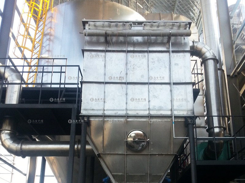 空氣經(jīng)過濾和加熱,進(jìn)入干燥器頂部空氣分配器,熱空氣呈螺旋狀均勻地進(jìn)入干燥室。料液經(jīng)塔體頂部的高速離心霧化器,(旋轉(zhuǎn))噴霧成極細(xì)微的霧狀液珠,與熱空氣并流接觸在極短的時(shí)間內(nèi)可干燥為成品。成品連續(xù)地由干燥塔底部和旋風(fēng)分離器中輸出,廢氣由風(fēng)機(jī)排空。